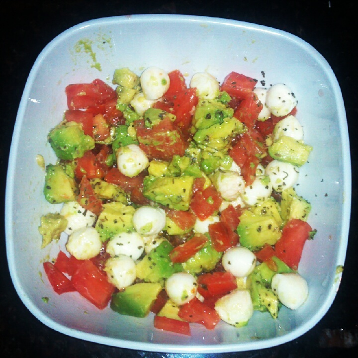 Mix avocado, tomato and mozzarella. Drizzle olive oil, add basil, salt, and pepper to taste. Mix and enjoy!