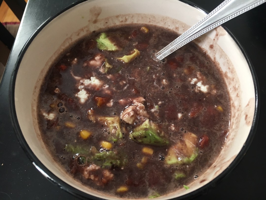 This time around I found the soup to be a little blander, so I put 1/4 can of chipotle in adobo sauce in my Magic Bullet and then in mixed it in the soup while cooking. It did the trick. I also used used roasted corn, because I saw the can while shopping and thought it sounded like the perfect combo with a rustic black bean soup. It was.